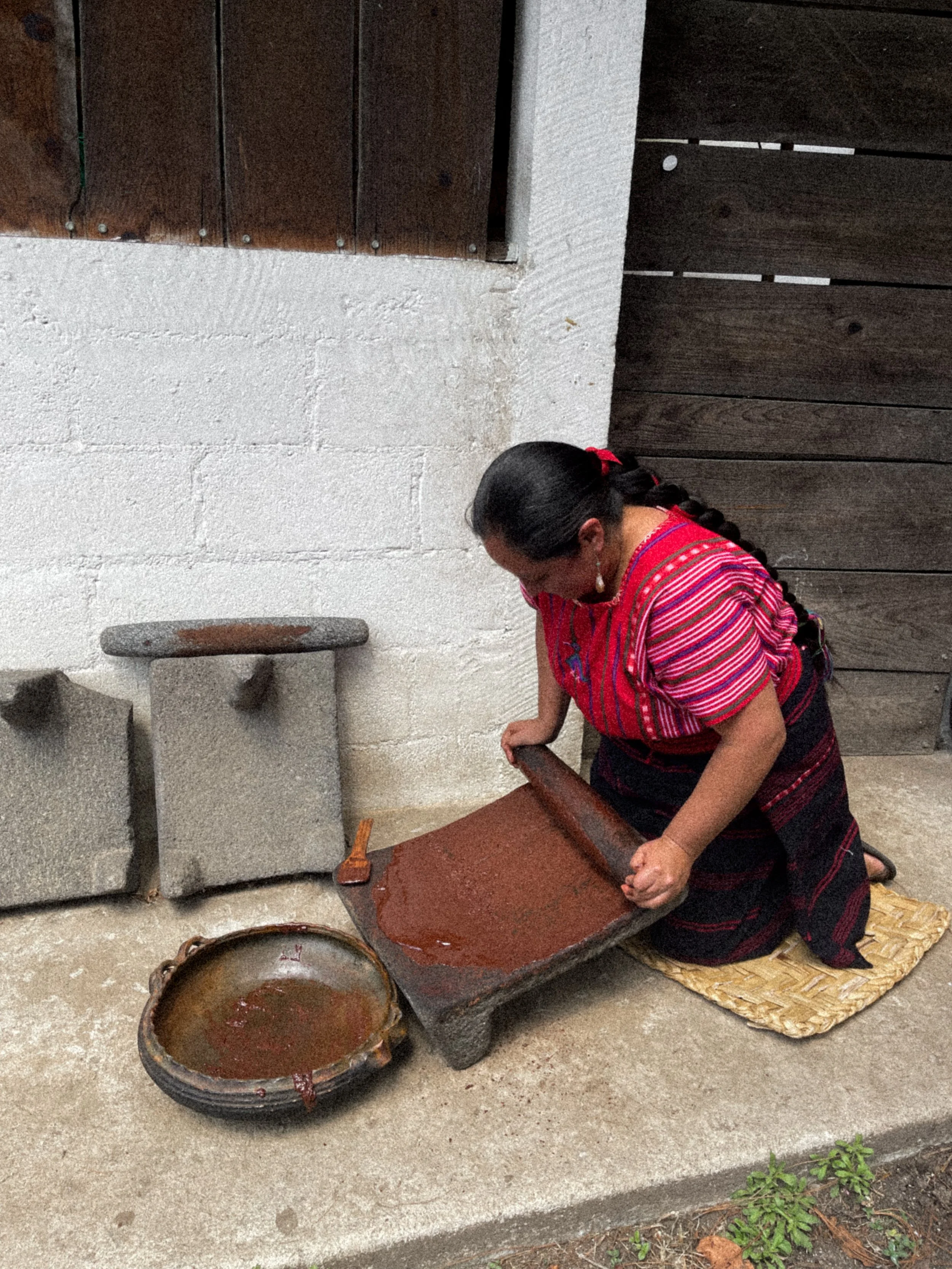 Nana Jessica, guardianess of ancestral cacao, grinding peeled cacao beans to the ceremonial grade cacao paste in the traditional Mayan way with the ‘metate’ (the name for the grinding stone).