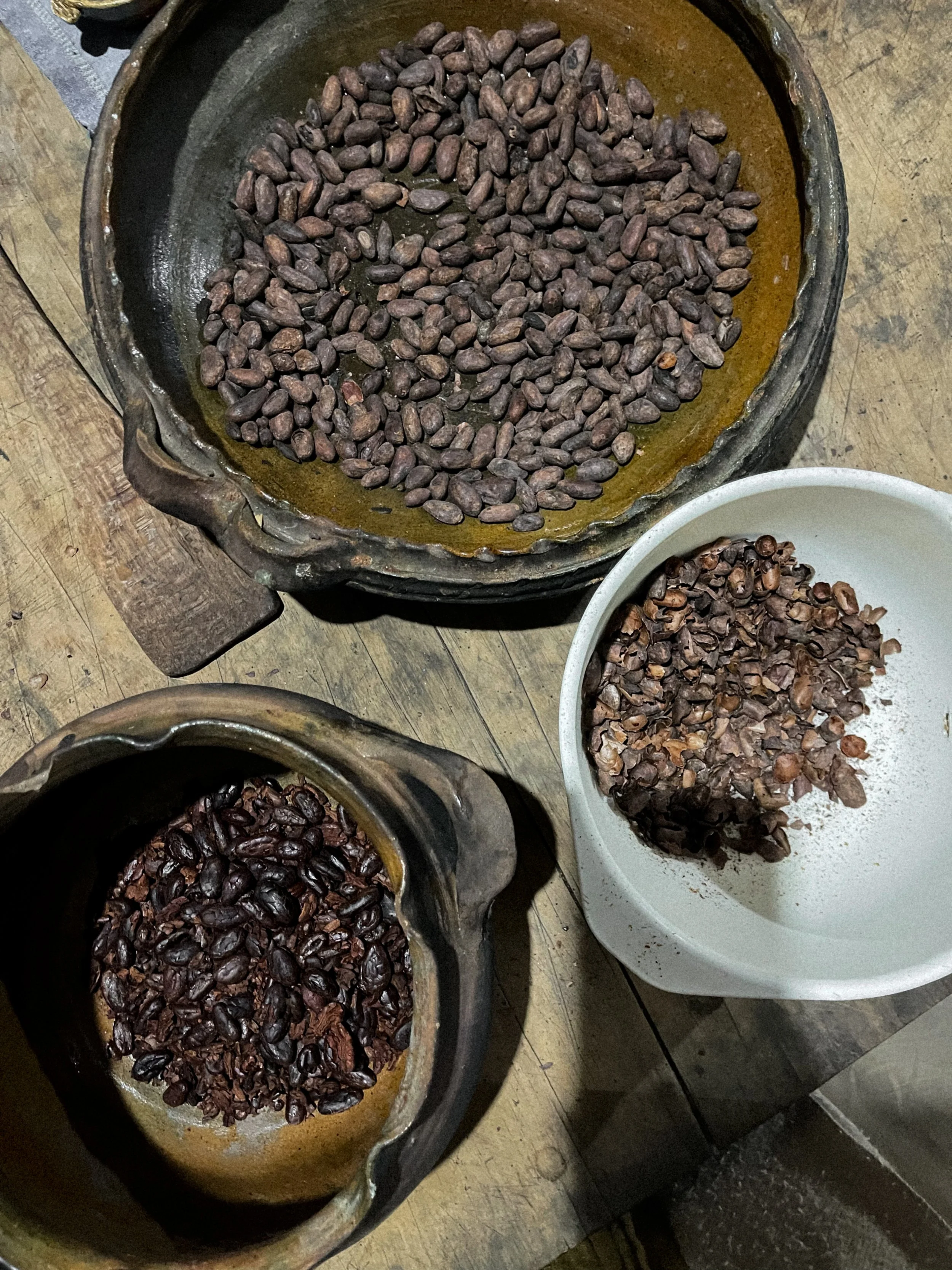 In the process of peeling the toasted cacao beans. Clockwise from top; toasted cacao beans, cacao husks, peeled cacao beans.